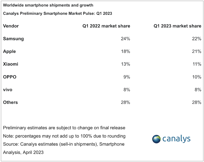 Ondanks beperkte verbeteringen in belangrijke ongunstige macrofactoren moet de markt zich nog altijd herstellen. Samsung is de enige grote speler die kwartaal-op-kwartaal herstel laat zien. Met een marktaandeel van 22% is het bedrijf marktleider. Apple beschikt over een marktaandeel van 21% en volgt Samsung op de voet. De kloof tussen de twee bedrijven is kleiner geworden, onder meer door een sterke vraag naar zijn iPhone 14 Pro-serie in Q1 2023.