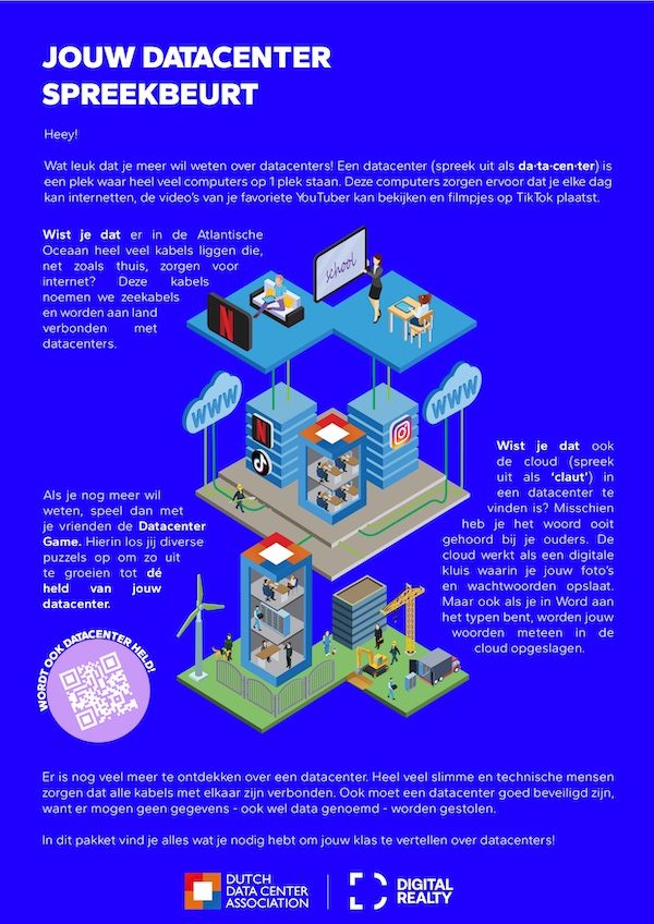 De Dutch Data Center Association (DDA) gaat in samenwerking met Digital Realty een spreekbeurtpakket uitbrengen. Het pakket wordt aangeboden aan basisschoolleerlingen van groep 5 tot 8, en is vrij te downloaden door de leerlingen zelf of docenten op de website van de DDA.
