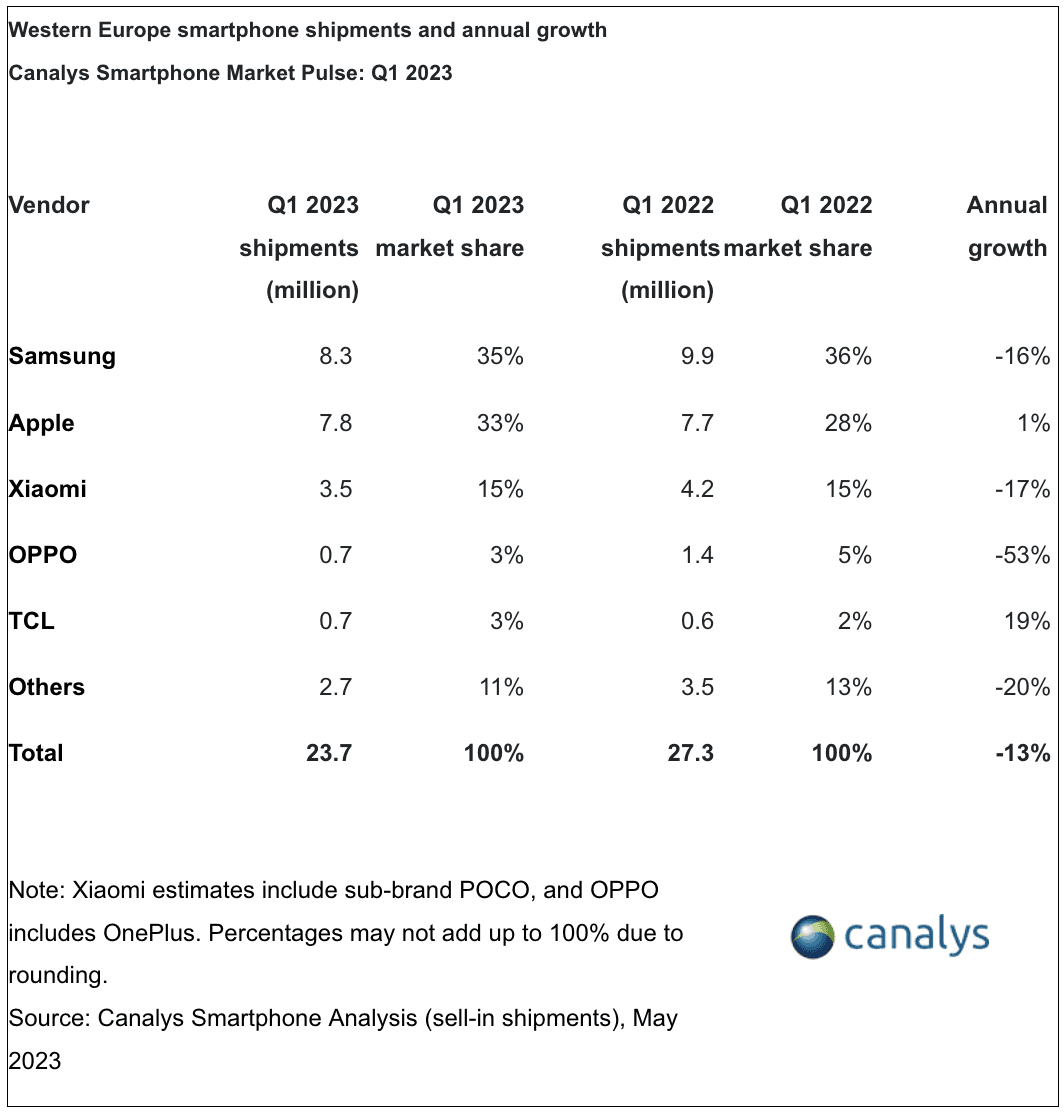 De smartphonemarkt in West-Europa is in het eerste kwartaal van 2023 met 13% gekrompen tot 23,7 miljoen verzonden eenheden, meldt Canalys. Vooral de moeilijke economische omstandigheden leidden tot een lagere consumentenvraag en langere aankoopcycli. De marktonderzoeker voorziet voor 2024 herstel en een groei van 6%, wat duidt op een potentiële heropleving van de markt.