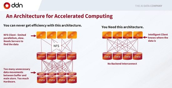 Het Californische bedrijf heeft een lange geschiedenis in het leveren van opslagarrays voor supercomputing en high-performance computing. AI-achtige toepassingen hebben GPU-verwerking nodig, wat betekent dat steeds meer ondernemingen high performance opslag zijn gaan gebruiken. DDN, de gevestigde specialist in het segment HPC, heeft hier profijt van en werkt al meer dan vier jaar samen met Nvidia en gebuikt de GPU’s van deze leverancier waaronder het Nvidia DGX-platform.