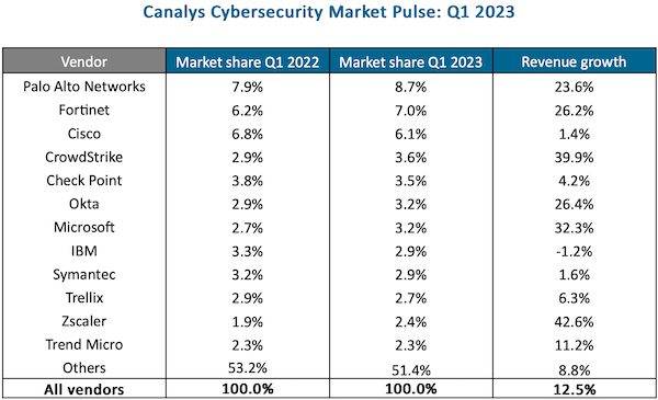 Dit blijkt uit cijfers van marktonderzoeker Canalys. Palo Alto Networks groeide in het eerste kwartaal met 23,6%, waarmee het zijn marktaandeel uitbreidde tot 8,7%. Het bedrijf is marktleider. Ook Fortinet verhoogde zijn aandeel met 26,2% tot 7,0%. Cisco verloor juist terrein en groeide slechts 1,4% toen het zijn orderachterstand voor firewalls wegwerkte. Canalys verwacht echter dat overnames en nieuwe platformlanceringen de prestaties van het bedrijf gaan verbeteren. CrowdStrike groeide met 39,9% en klimt naar de vierde positie, voor Check Point, dat met 4,2% groeide. Ook Okta (+26,4%) en Microsoft (+32,3%) winnen marktaandeel.