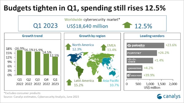 De wereldwijde markt voor cyberbeveiliging is in het eerste kwartaal van 2023 met 12,5% op jaarbasis gegroeid tot 18,6 miljard dollar. De markt groeit hiermee sneller dan de rest van de technische sector, ondanks de verslechterende macro-economische omstandigheden.