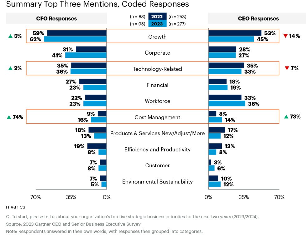 Dit blijkt uit onderzoek van Gartner onder 422 actief werkende CEO's, CFO's en andere senior executive bedrijfsleiders, uitgevoerd tot en met december 2022. Hoewel CFO's en CEO's het eens zijn over groei als hun topprioriteit, verschilt hun nadruk op deze en andere prioriteiten. De tweede topprioriteit van CFO's is bijvoorbeeld corporate action zoals fusies en overnames en herstructureringen (41%), wat op de vierde plaats staat voor CEO's (27%).