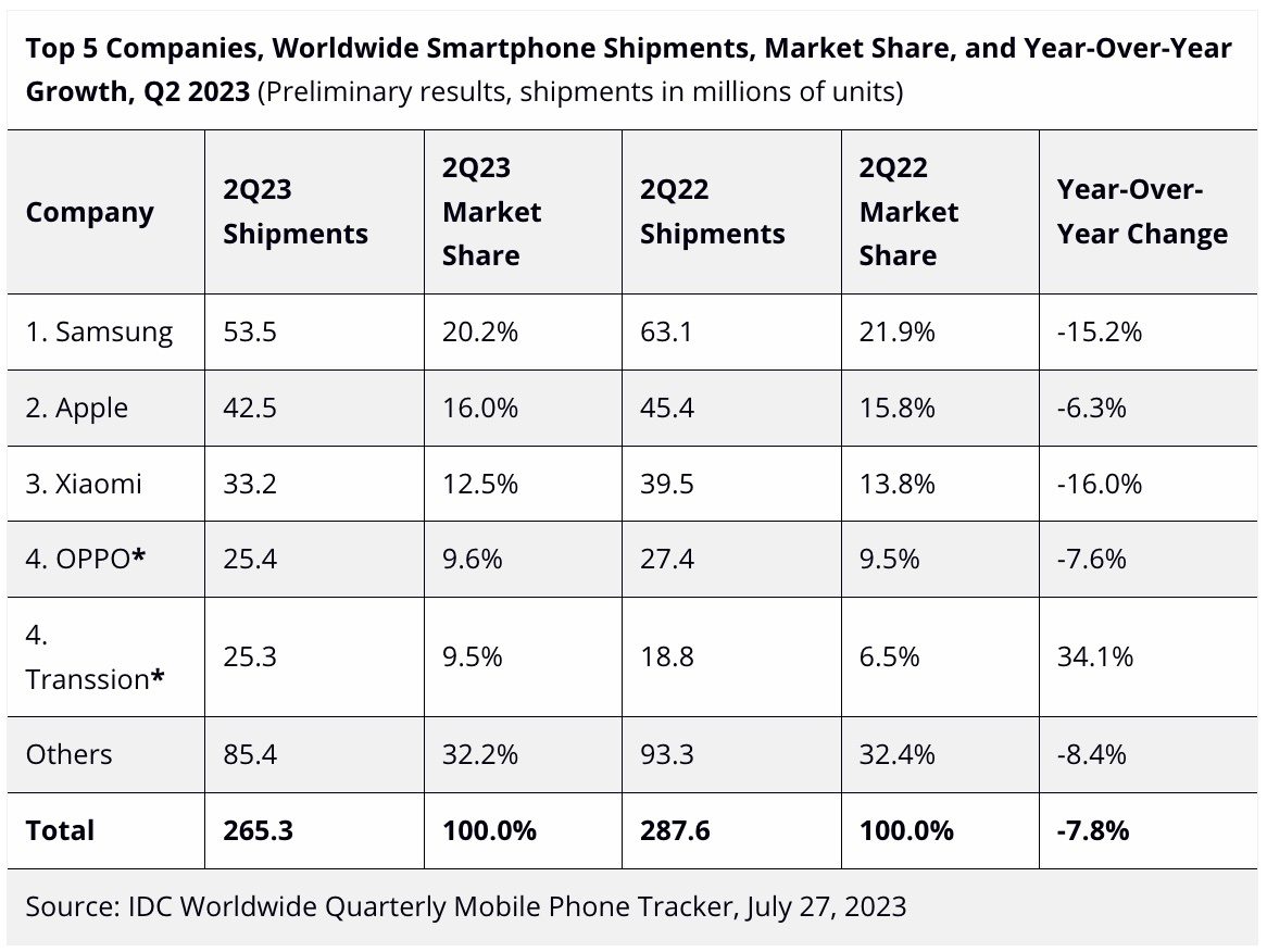 Wereldwijd zijn in het tweede kwartaal van 2023 zo'n 7,8% minder smartphone verscheept dan in dezelfde periode een jaar eerder. In absolute aantallen gaat het om 265,3 miljoen stuks. Wel vertraagt het tempo waarmee de smartphonemarkt krimpt.