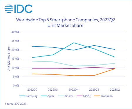 China zag in 2Q23 een jaar-op-jaar daling van 2,1% na vijf kwartalen van significante dubbelcijferige krimp. Hoewel dit beter is dan de afgelopen kwartalen, blijven het consumentenvertrouwen en de bestedingen laag. Zelfs het langverwachte 618 online shopping festival in juni, dat naar verwachting de verkoop in China zou stimuleren, zag een jaar-op-jaar daling van 6,5% in de verkoop van smartphones.
