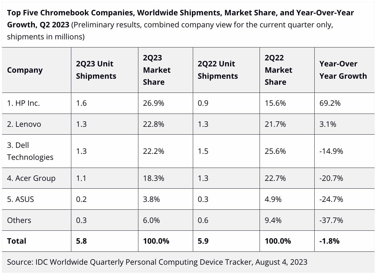 Het aantal verscheepte Chromebooks is in het tweede kwartaal met 1,8% gedaald. In totaal gaat het om 5,8 miljoen verscheepte units. De beperkte krimp in dit segment schrijft IDC toe aan extra order met het oog op de verwachte stijging van licentiekosten voor Chrome OS in de tweede helft van 2023.
