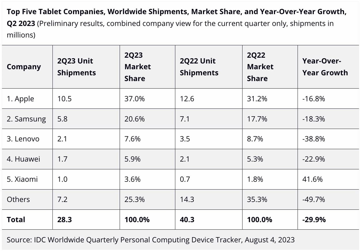 De markt voor tablets is in het tweede kwartaal van 2023 met 29,9% gekrompen. Het totaal aantal verscheepte tablets wereldwijd daalt tot 28,3 miljoen stuks.