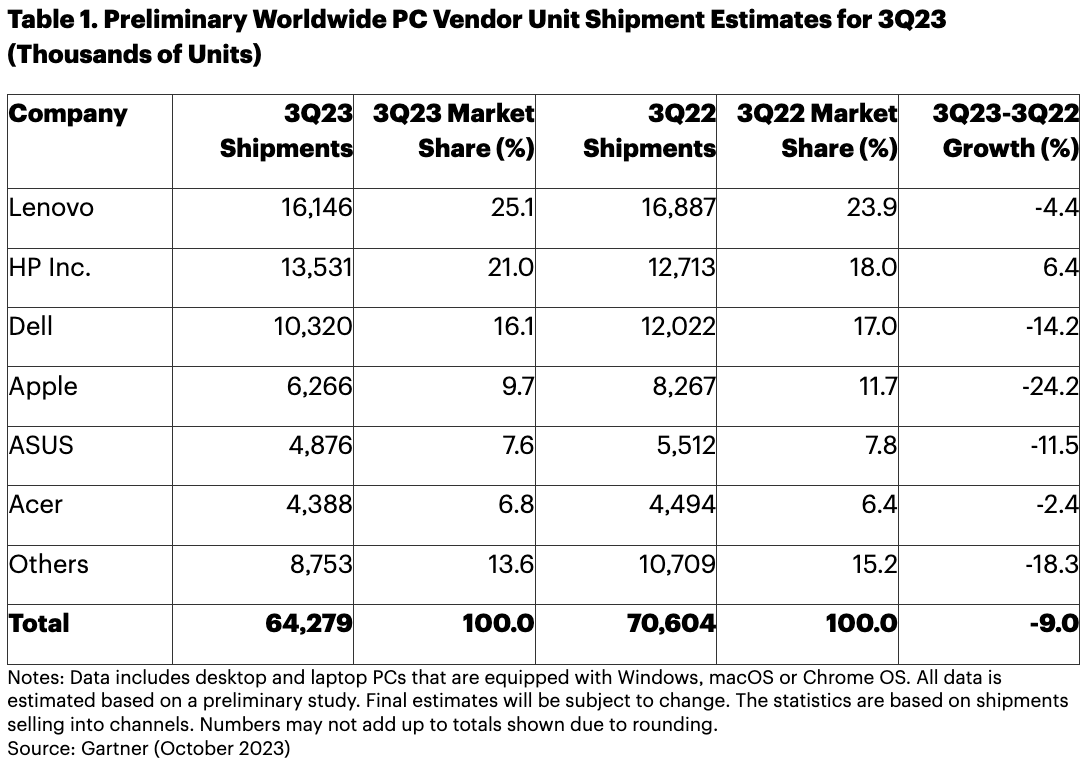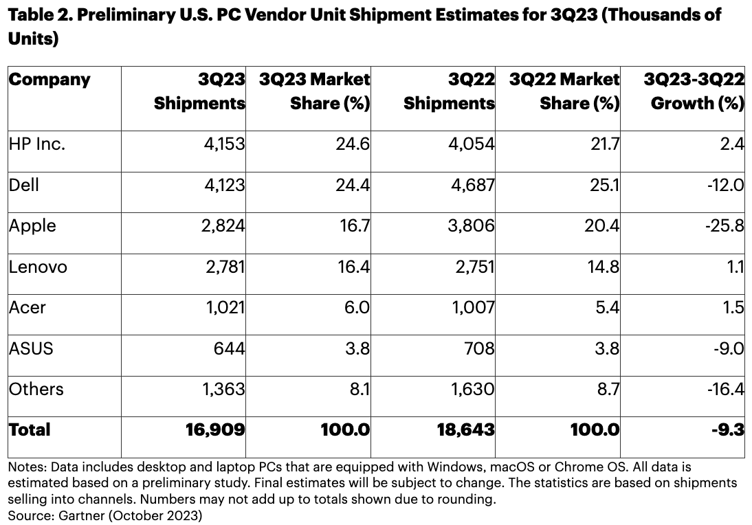 De Amerikaanse pc-markt daalde in het derde kwartaal van 2023 met 9,3% (zie Tabel 2).