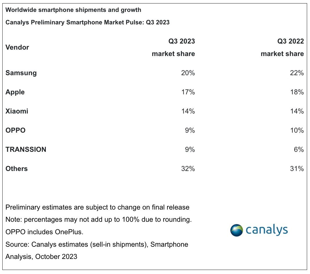 Amber Liu, analist bij Canalys schrijft het herstel op de smartphonemarkt onder meer toe aan de lancering van nieuwe producten door Huawei, Apple en veel andere leveranciers. Liu: “Huawei's nieuwe Mate-serie, met de nieuwste Kirin-chipset, heeft enthousiaste reacties van consumenten op het vasteland van China opgeleverd. Operators haasten zich om Huawei-apparaten in te slaan om aan de stijgende vraag te voldoen. Ondertussen versterkt Apple zijn nieuwe iPhone 15-serie met sterk verbeterde prestaties en functies om de vraag voortdurend te stimuleren. Aan de andere kant, terwijl Samsung de blootstelling aan het instapsegment afbouwt om zich te concentreren op winstgevendheid, profiteerden Xiaomi en TRANSSION snel van het herstel in de opkomende markten met concurrerende producten en kanaalbetrokkenheid. Deze overwinningen op de korte termijn kunnen uitmonden in een duurzamer succes op de lange termijn als Xiaomi en TRANSSION hun kaarten goed spelen.”