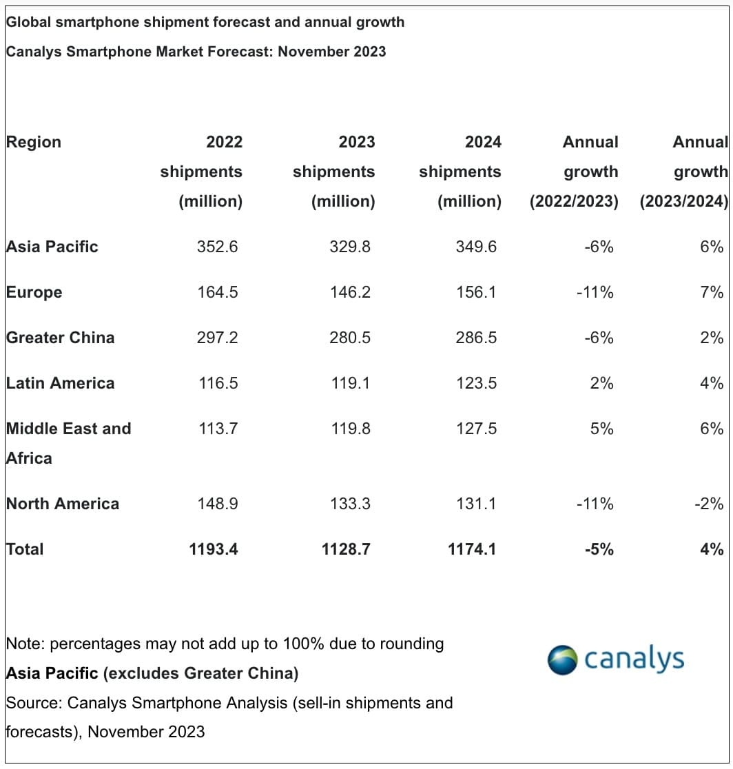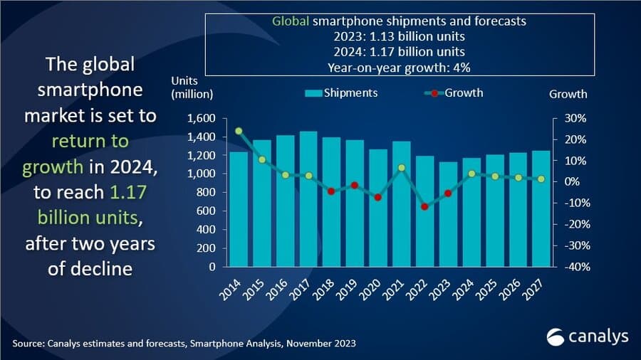 De wereldwijde smartphonemarkt duidt op eerste tekenen van herstel na een daling van 12% in 2022, voorspelt marktonderzoeker Gartner volgens nieuwe voorspellingen van Canalys. Hoewel de marktonderzoeker verwacht dat de verzendingen in 2023 nog steeds met 5% dalen, wijst de afnemende daling op stabilisatie nu regio's als het Midden-Oosten, Afrika en Latijns-Amerika dit jaar weer een groei van respectievelijk 9%, 3% en 2% bereiken. In het volledige jaar 2023 worden naar verwachting 1,13 miljard smartphones verscheept, waarna de markt in 2024 groeit tot 1,17 miljard stuks. De smartphonemarkt verscheept naar verwachting in 2027 1,25 miljard exemplaren, wat een CAGR (2023 tot 2027) oplevert van 2,6%.