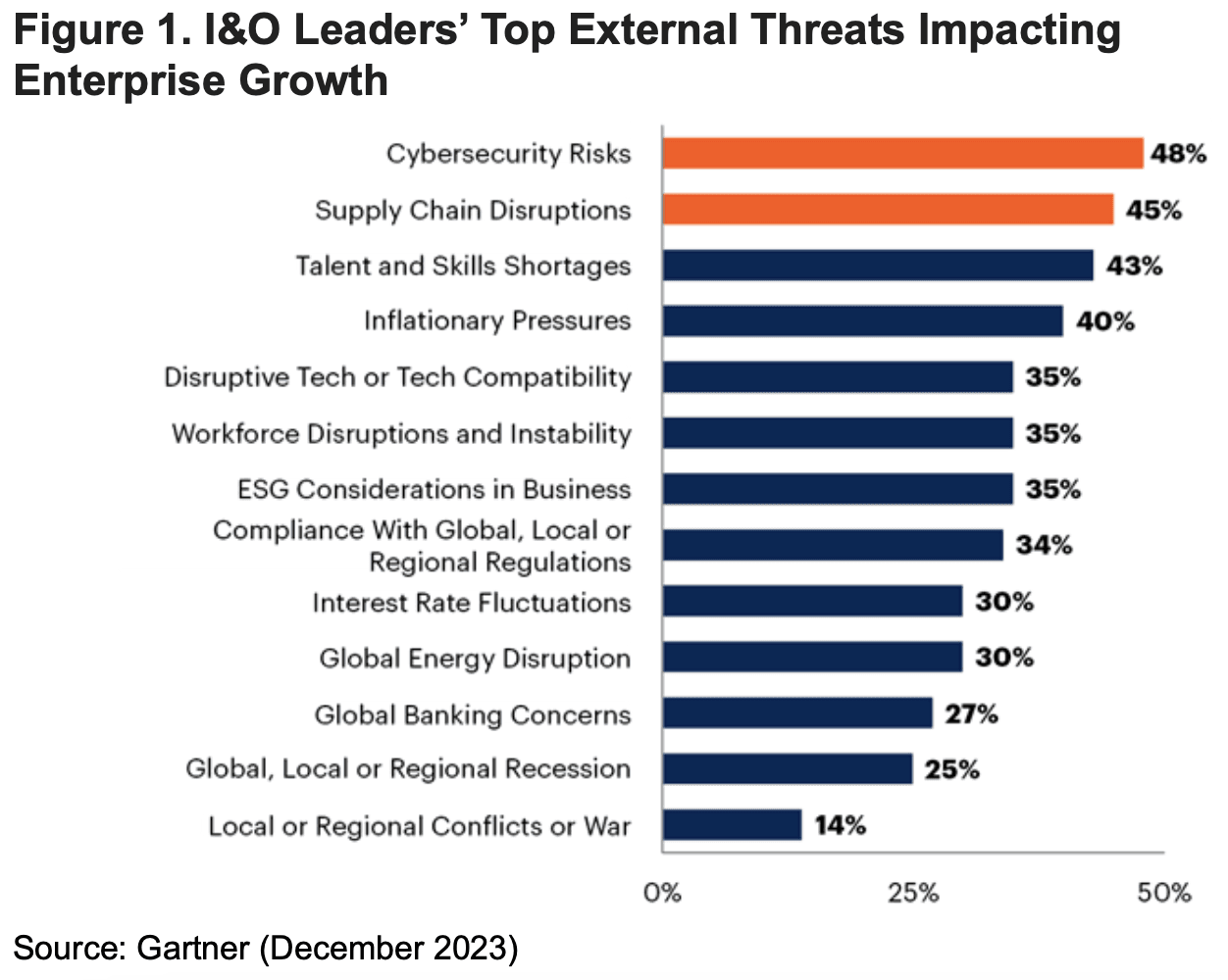 Dit blijkt uit onderzoek van Gartner onderzoek 122 I&O-leiders van bedrijven in Noord-Amerika, EMEA en Azië/Pacific, waarvan de groei in 2022 en 2023 werd beïnvloed door externe bedreigingen. Het onderzoek is van april tot en met juli 2023 uitgevoerd.