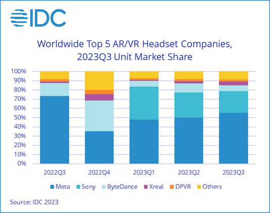 Meta, marktleider in het derde kwartaal van 2023 met een marktaandeel van 55,2%, wist in de eerste drie kwartalen van 2023 (vóór de lancering van Quest 3) meer dan tien keer het verwachte volume van Apple te verzenden. IDC verwacht dat Meta in 2024 verdere groei realiseert.
