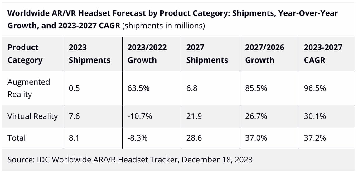 Ondertussen wordt verwacht dat de vraag naar AR-headsets in 2024 eveneens groeit door de beschikbaarheid van goedkopere met kabel verbonden headsets van onder meer Xreal en Rokid, die vaak dienen als vervanging van monitoren en tegelijkertijd de productiviteit verhogen of de mediaconsumptie-ervaring verbeteren. Meer geavanceerde stand-alone headsets zoals Microsoft's HoloLens 2 of de Magic Leap 2 blijven eveneens verkrijgbaar, al groeit de vraag hiernaar trager dan AR-headsets met een kabel. IDC verwacht dat in 2024 in totaal 845.000 AR-headsets worden verzonden, wat neerkomt op een stijging van 85,6% vergeleken met 2023.