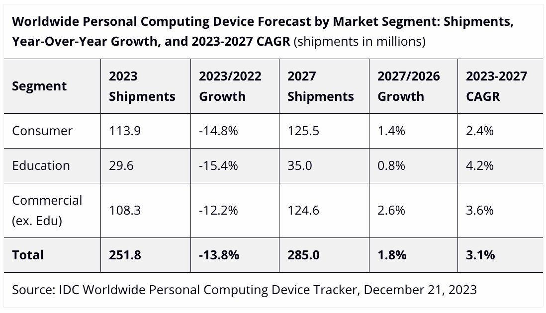 IDC noemt twee opeenvolgende jaren van dalingen met dubbele cijfers op jaarbasis een 'ongekende trend op de pc-markt'. De marktonderzoeker verwacht echter herstel van de markt voor 2024 en daarna. Diverse factoren dragen daaraan bij, waaronder: