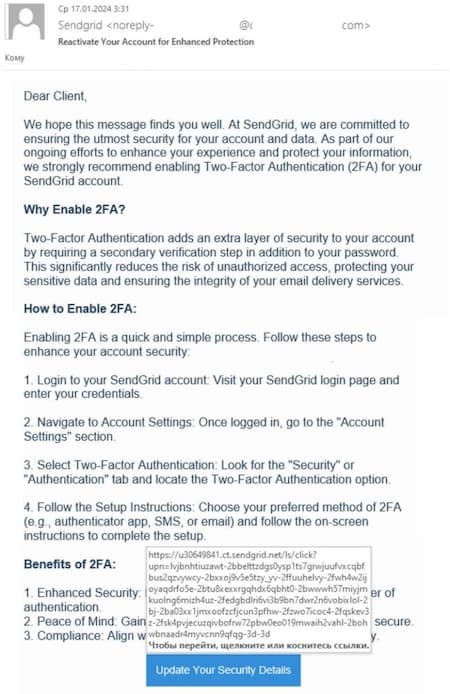 Kaspersky wijst op een phishing-campagne die deze aanvalsmethode verfijnt door gegevens van de SendGrid ESP te verzamelen door phishing e-mails rechtstreeks via de ESP zelf te verzenden. Aanvallers vergroten zo de kans op succes en spelen in op het vertrouwen van ontvangers in communicatie van bekende bronnen. De phishing e-mails lijken afkomstig te zijn van SendGrid, uiten bezorgdheid over de beveiliging en dringen er bij ontvangers op aan om tweefactorauthenticatie (2FA) in te schakelen om hun accounts te beschermen. De link leidt gebruikers echter door naar een frauduleuze website die de SendGrid inlogpagina nabootst, waar de gegevens van de slachtoffers worden verzameld.