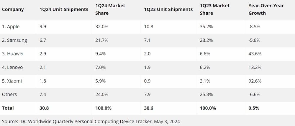 Na twee jaar van krimp laat de tabletmarkt een bescheiden groei zien van 0,5% in het eerste kwartaal van 2024. In totaal zijn 30,8 miljoen units verscheept.