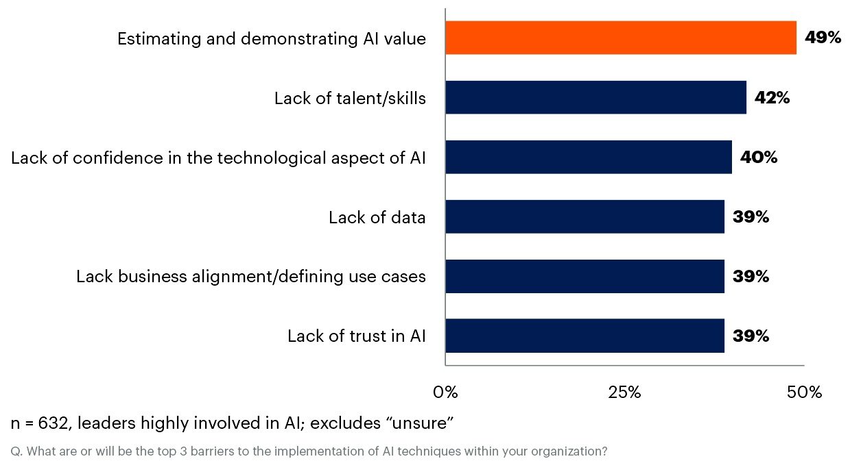 Het belangrijkste obstakel voor de adoptie van AI, is de moeilijkheid bij het inschatten en aantonen van de waarde van AI-projecten. 49% van de respondenten wijst hierop. Dit probleem is daarmee groter dan andere barrières, zoals tekorten aan talent, technische problemen, datagerelateerde problemen, gebrek aan afstemming tussen bedrijven en vertrouwen in AI.