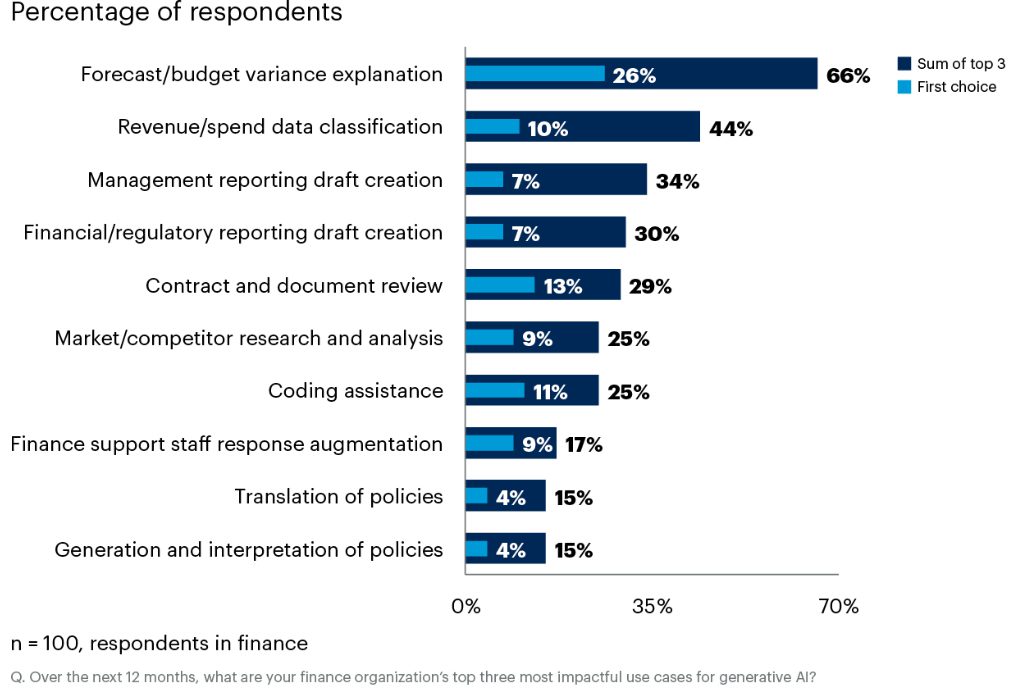 Financieel leiders verwachten dat generatieve AI (GenAI) de meest impactvolle use case zal hebben in het verklaren van verschillen tussen afwijkingen in voorspellingen en budgetten. Ook in het classificeren van omzet-/uitgavengegevens en managementrapporten zien zij kansen.