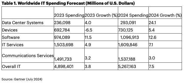 De uitgaven aan datacentersystemen stijgen naar verwachting in 2024 met 24%, terwijl Gartner in het voorgaande kwartaal nog een groei van 10% voorspelde. Dit is voor een groot deel te danken aan het groeiend aantal plannen op het gebied van GenAI. (Zie Tabel 1).