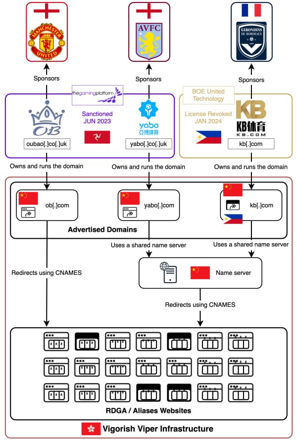 - Verbonden dreigingen. Tientallen ogenschijnlijk niet-verwante gokmerken die adverteren via sponsordeals met bepaalde Europese sportteams maken gebruik van Vigorish Viper-technologie. Hoewel deze merken afzonderlijk lijken te opereren, functioneren ze meer als de takken van een franchise, wat nogmaals onderstreept hoe belangrijk een holistische kijk op dergelijke dreigingen is. Alleen DNS kan dit bieden.