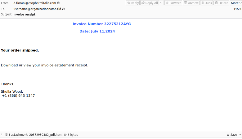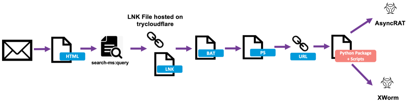 Berichten uit deze campagne bevatten HTML-bijlagen met een zoekopdracht naar een LNK-bestand. Na het uitvoeren hiervan wordt er omgeleid naar een gecodeerd BAT-bestand met PowerShell voor het downloaden van een Python-installatiepakket met scripts en het uitvoeren van AsyncRAT en Xworm.