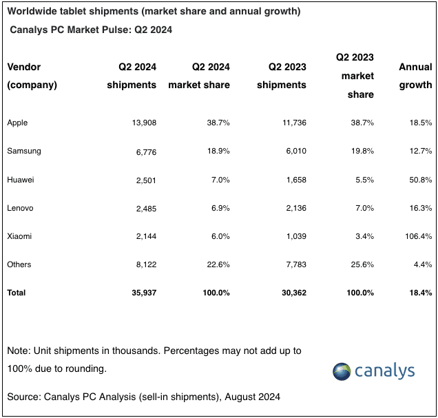 In Q2 2024 behield Apple zijn leidende positie op de wereldwijde tabletmarkt, met 13,9 miljoen verzonden iPads en een marktaandeel van 39%. Samsung had een jaar-op-jaar stijging van 13% en verzonden 6,8 miljoen eenheden, gedreven door sterke verkopen van zijn topmodellen en groeiende vraag in opkomende markten in de regio Azië-Pacific.
