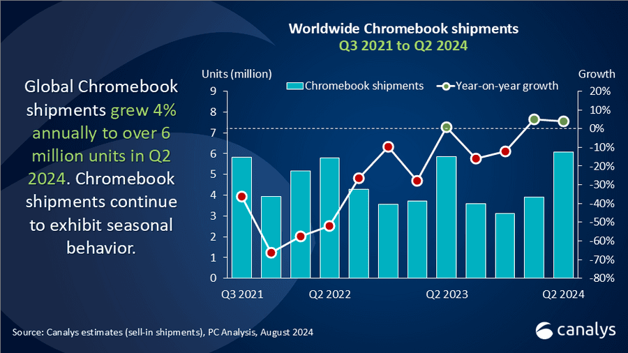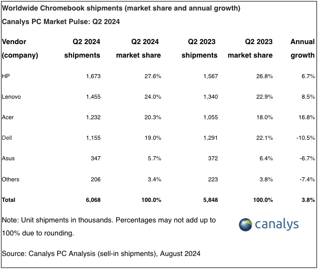 Op de Chromebook-markt behield HP de eerste plaats met 1,7 miljoen verzonden eenheden in Q2 2024 voor een marktaandeel van 28%. Met een stijging van 9% op jaarbasis kwam Lenovo op de tweede plaats, met 1,5 miljoen verzonden Chromebooks wereldwijd. Acer, dat dit kwartaal het meest groeide, claimde de derde plaats met 1,2 miljoen verzonden eenheden, gesteund door het succes in overheidsaanbestedingen in de regio Azië-Pacific. Dell en Asus stonden respectievelijk op de vierde en vijfde plaats, die beide te kampen hadden met jaar-op-jaar dalingen in verzendingen.