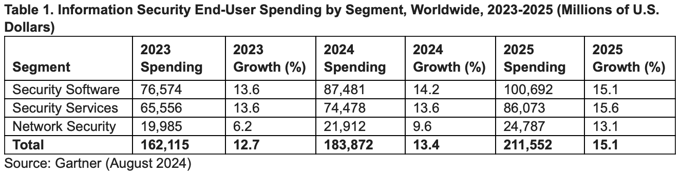 Eindgebruikers investeren in 2025 in totaal 212 miljoen dollar in informatiebeveiliging. Het gaat om een stijging van 15,1% ten opzichte van 2024, waarin de investeringen naar verwachting uitkomen op 183,9 miljard dollar. Onder meer de populariteit van kunstmatige intelligentie en generatieve AI evenals de toenemende verschuiving naar de cloud zorgen voor meer vraag.