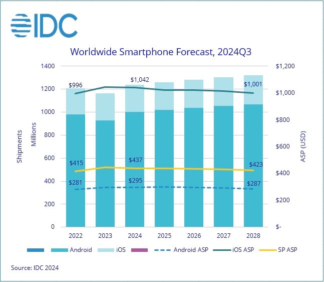 Een snelle groei van Android van 7,6% jaar-op-jaar in 2024, met name in APeJC, Latijns-Amerika, het Midden-Oosten, Afrika en China in met name het lage segment is cruciaal voor de verwachte groei van 6,2%. iOS maakt daarentegen slechts een beperkte groei van 0,4% door in 2024. Ondanks recordprestaties in opkomende markten zoals India, ondervindt Apple uitdagingen in grote markten zoals China, de VS en Europa. IDC voorspelt dat Apple het in 2025 beter doet; het verwacht dat iOS met 3,1% jaar-op-jaar groeien, wat de voorspelde groei van Android van 1,7% in diezelfde periode zal overtreffen.