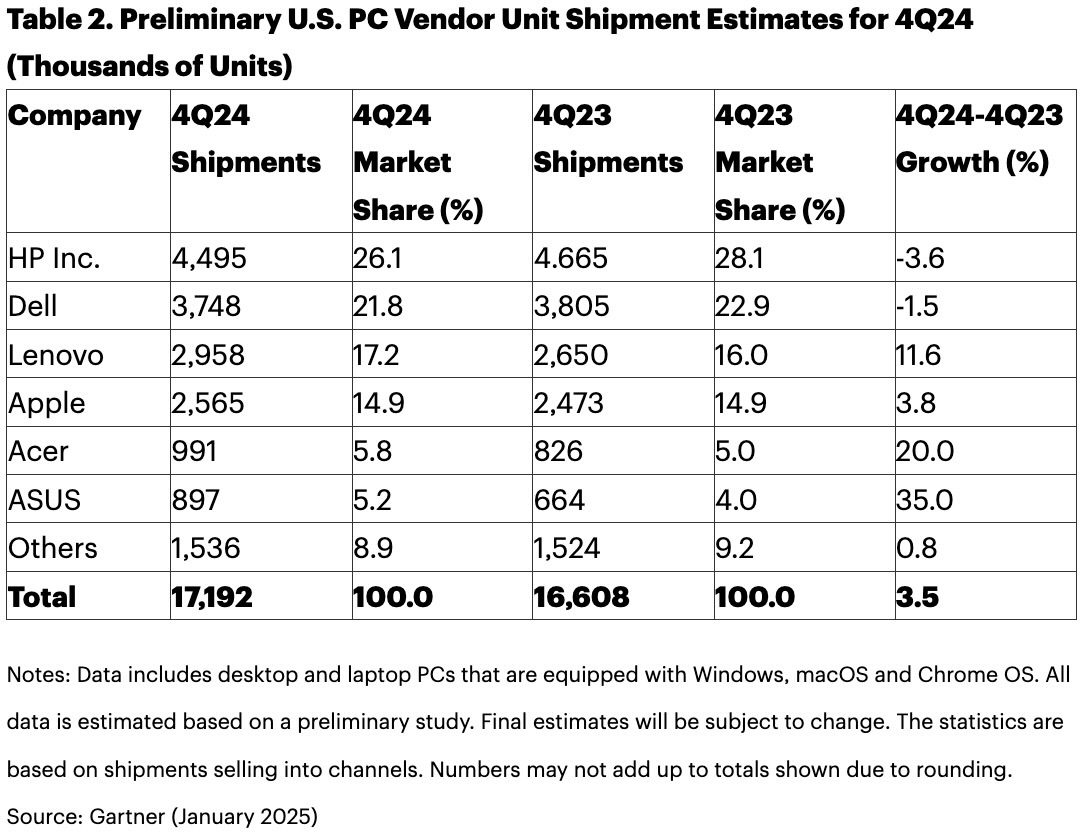De rangorde van de zes grootste PC-merken blijft in het vierde kwartaal van 2024 ongewijzigd, hoewel de resultaten variëren. Lenovo groeit voor het vijfde kwartaal op rij met 4,2% op jaarbasis, ondanks zwakke prestaties in de regio Azië-Pacific en Canada. HP Inc. noteert een daling na vijf opeenvolgende kwartalen van groei, en Dell registreert een lichte daling van 0,1% ten opzichte van het vierde kwartaal van 2023. Regionaal laat de Amerikaanse markt een groei van 3,5% zien, terwijl de EMEA-markt na twee kwartalen van groei weer een daling van 1,6% kent. In de regio Azië-Pacific wordt de groei sterk beïnvloed door een zwakke vraag in China, waar leveringen met 12% afnemen.