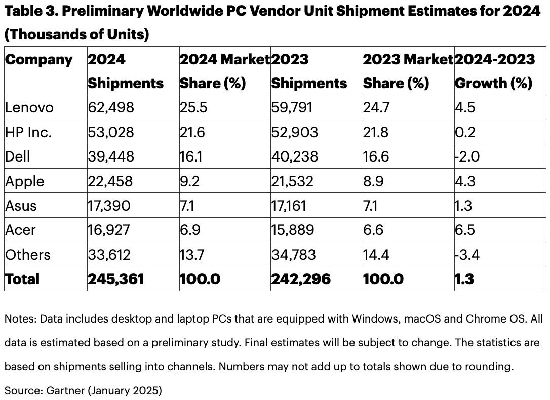 Het gaat om vijfde kwartaal op waarin de PC-markt groeit. Over heel 2024 worden er 245,3 miljoen PC's geleverd, een toename van 1,3% ten opzichte van 2023. Toch blijft het totale volume voor het tweede jaar op rij onder de 250 miljoen eenheden.