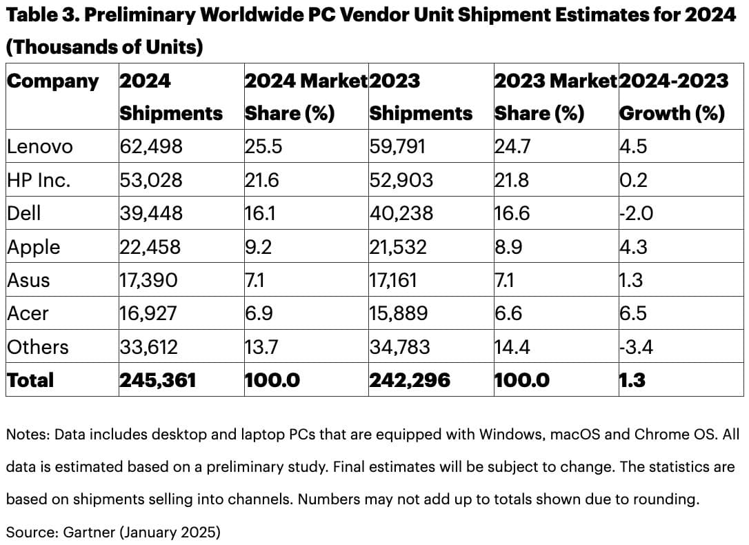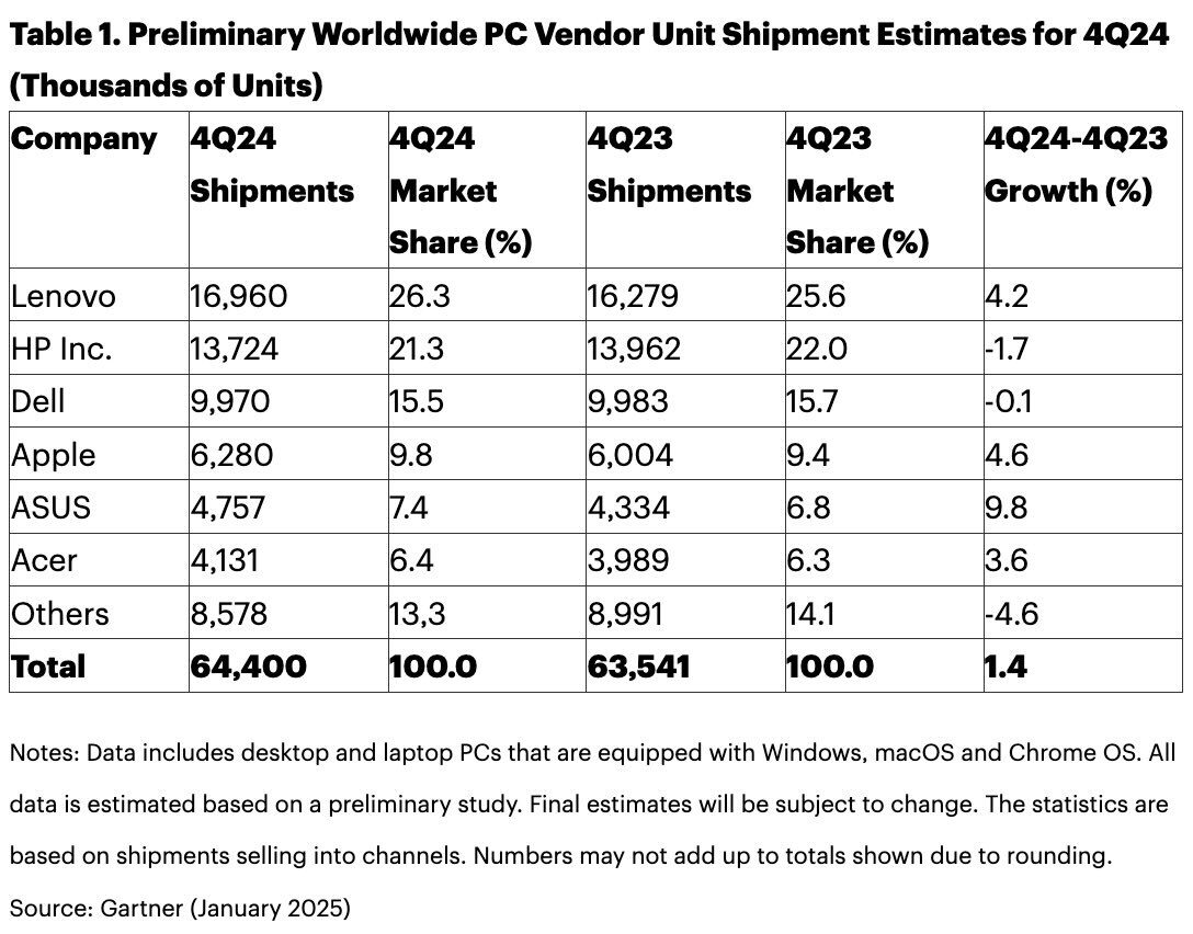 Wereldwijde zijn 64,4 miljoen PC's verscheept in het vierde kwartaal van 2024, blijkt uit cijfers van Gartner. Dit is 1,4% meer dan in hetzelfde kwartaal in 2023.