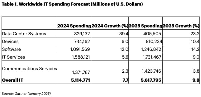 Wereldwijde IT-uitgaven groeien dit jaar $5,61 biljoen, verwacht marktonderzoeker Gartner. Dit is een stijging van 9,8% ten opzichte van 2024.