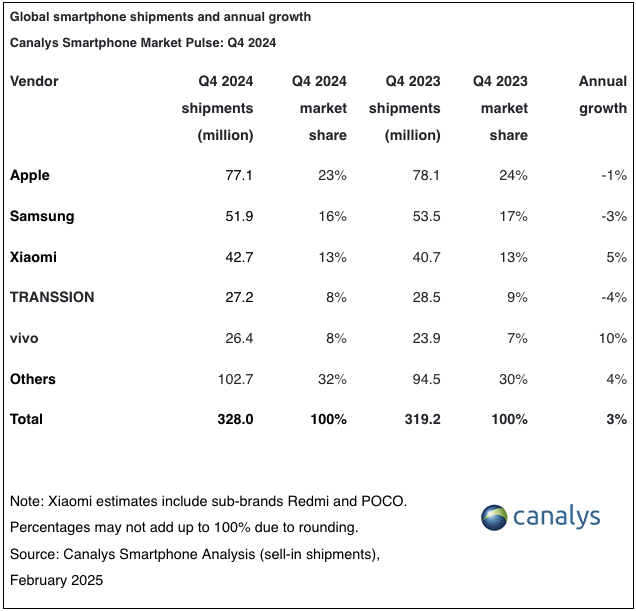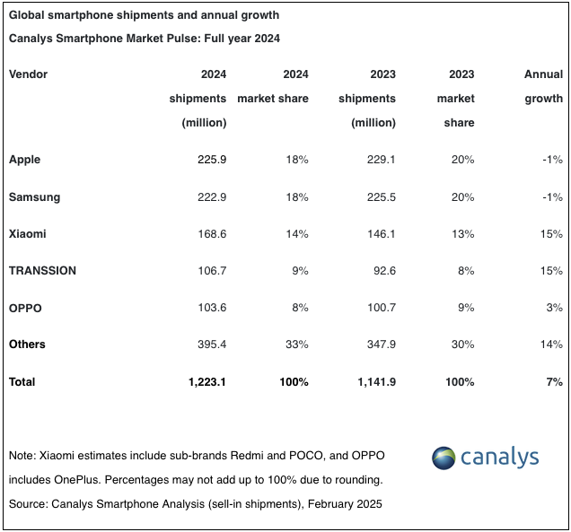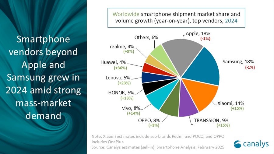 Xiaomi houdt de derde plaats in handen en is de grootste aanjager van de volumegroei in de industrie in 2024. Door sterke prestaties in China en verdere uitbreiding naar opkomende markten is het aantal verscheepte toestellen met 15% gestegen tot 168,6 miljoen eenheden. TRANSSION bereikte voor het eerst de vierde plaats, terwijl OPPO (inclusief OnePlus) de top vijf afrondde met groeicijfers van respectievelijk 15% en 3%, wat neerkomt op 106,7 miljoen en 103,6 miljoen eenheden.