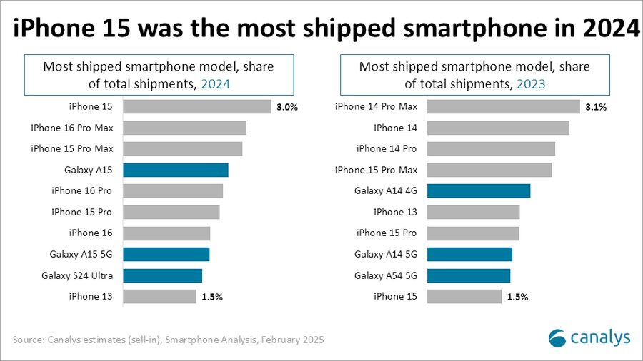 “Apple en Samsung bleven sterk presteren dankzij de aanhoudende vraag naar vlaggenschipmodellen, wat de trend naar premiumtoestellen in de markt weerspiegelt,” aldus Sanyam Chaurasia, senior analist bij Canalys. “Consumenten kiezen steeds vaker voor de premiumversies van vlaggenschipmodellen, mede dankzij duidelijkere differentiatie tussen modellen binnen dezelfde serie. Bij Apple lag het aantal verscheepte 16 Pro- en Pro Max-modellen in 2024 11% hoger dan bij de 15 Pro- en Pro Max-modellen in 2023, met een totaal van meer dan 55 miljoen eenheden. De sterke prestaties van de Pro-modellen in de 16-serie droegen bij aan een beter lanceerjaar voor de iPhone 16 vergeleken met de iPhone 15. Samsung realiseerde het hoogste verkoopvolume van de S-serie sinds 2019, waarbij de focus meer dan ooit op de Ultra-variant lag. Met de introductie van de Galaxy S25 wil Samsung deze groei voortzetten door in te zetten op AI-functionaliteiten, inclusief een Gemini Advanced-abonnement. Daarnaast is het upgraden van gebruikers van de mid-range A-serie naar de standaard- en plusmodellen een belangrijk onderdeel van Samsungs strategie.”