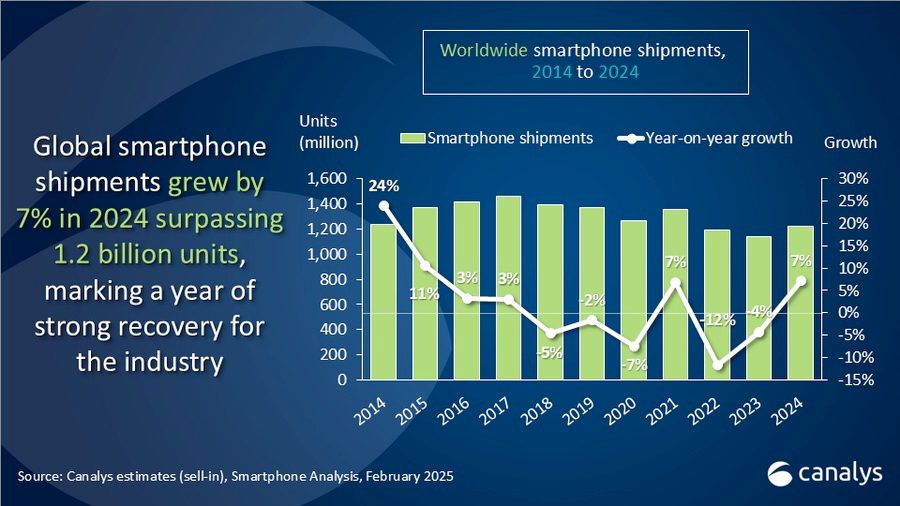 De wereldwijde smartphonemarkt is volgens cijfers van Canalys in 2024 met 7% gegroeid, tot een totaal van 1,22 miljard eenheden. De markt herstelt daarmee na twee opeenvolgende jaren van krimp. Apple is opnieuw marktleider.