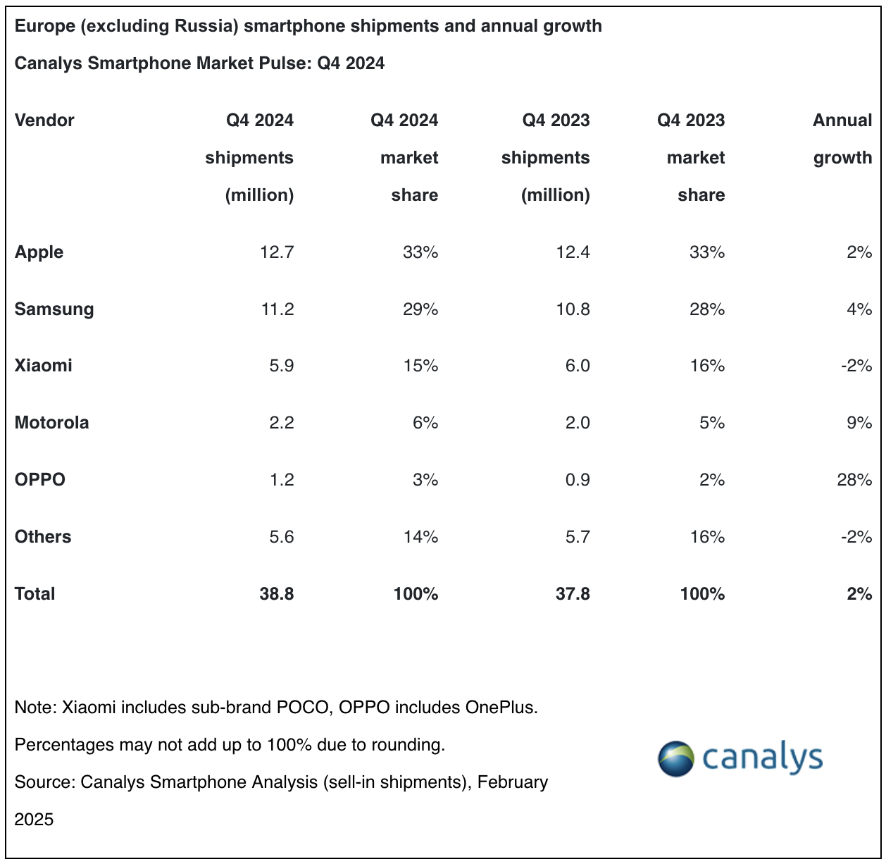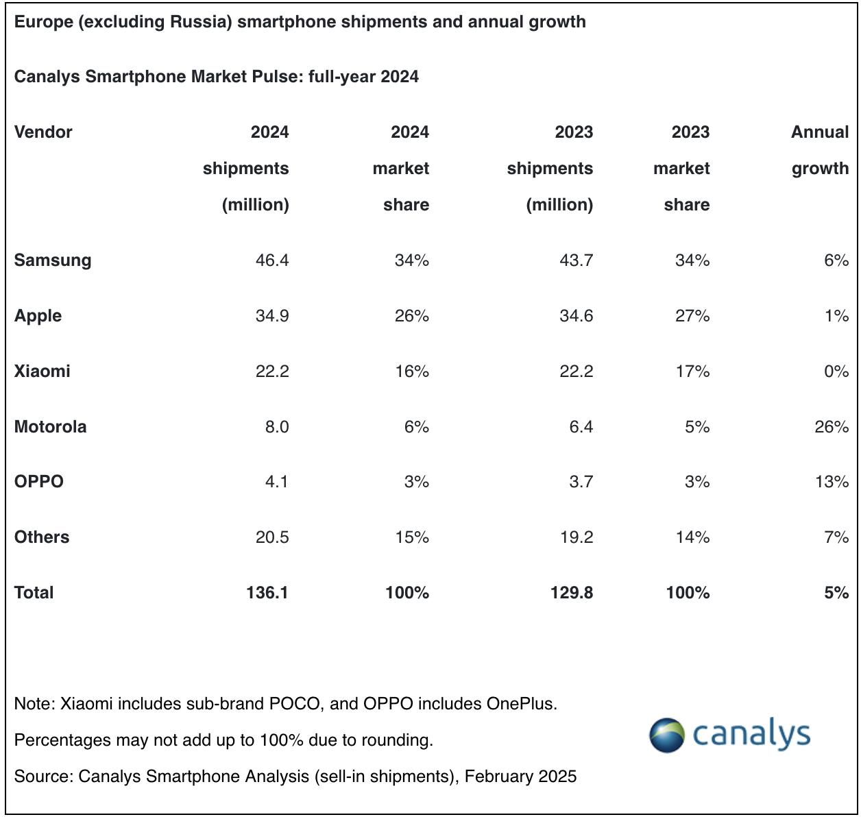 Dit blijkt uit cijfers van marktonderzoeker Canalys, onderdeel van Omdia. Samsung behoudt zijn positie als grootste smartphonemerk in Europa en zag zijn leveringen in 2024 met 6% stijgen naar 46,4 miljoen eenheden. Apple was in het vierde kwartaal van 2024 de grootste leverancier, dankzij de positieve ontvangst van de iPhone 16-serie en de aanhoudende vraag naar de iPhone 13 en 14. De leveringen van iPhones in Europa groeiden met 1% ten opzichte van 2023, tot 24,9 miljoen toestellen. Xiaomi eindigde op de derde plaats met 22,2 miljoen verscheepte Redmi-, POCO- en Xiaomi-smartphones, hetzelfde aantal als in 2023. Motorola kende zijn beste jaar ooit in Europa en groeide met 26% tot meer dan 8 miljoen eenheden. OPPO, inclusief OnePlus, sloot de top vijf af met een groei van 13% tot 4,1 miljoen toestellen.