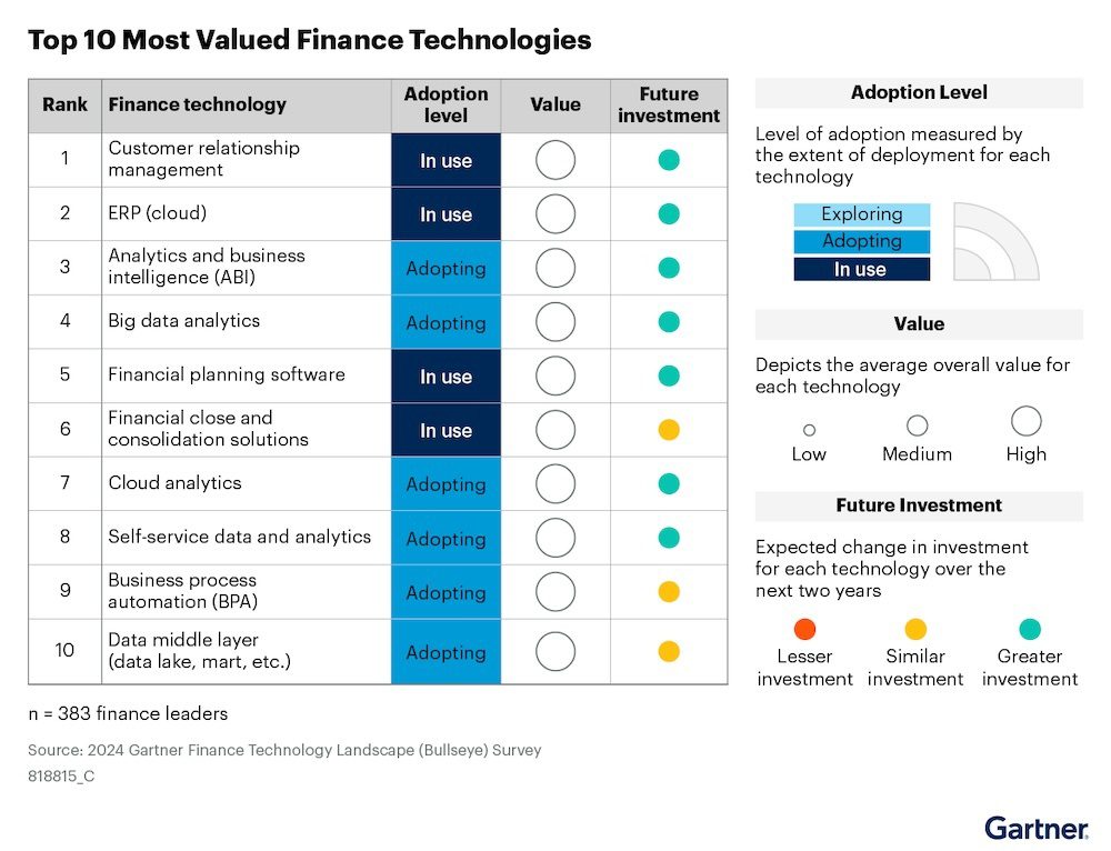 CRM-technologie, cloud-ERP en analytische en business intelligence (ABI)-tools de top drie meest gewaardeerde technologieën binnen de financiële functie zijn, blijkt uit onderzoek van Gartner. De marktonderzoeker verwacht dan ook dat CFO's en financieel leiders de komende jaren veel investeren in de technologieën.