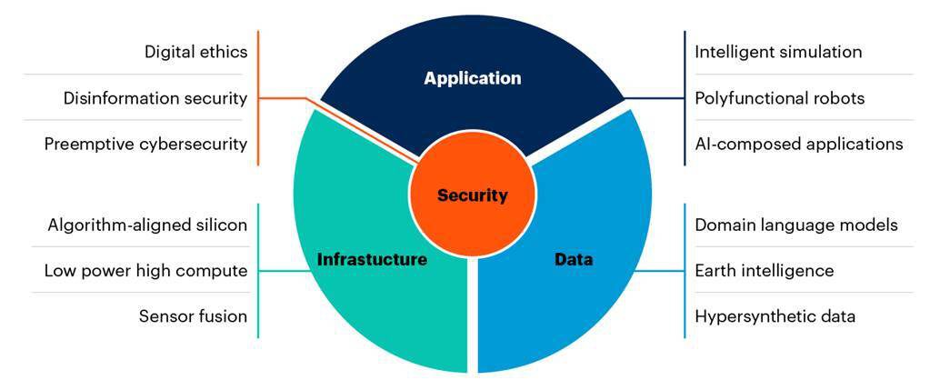 Gartner omschrijft de ontwikkelingen als opkomende technologische disrupties. Elke ontwikkeling is op zichzelf belangrijk. In combinatie met elkaar definiëren zij echter bredere oplossingen voor nieuwe business practices. Een voorbeeld is geavanceerde GenAI, wat nieuwe oplossingen mogelijk maakt rond earth intelligence en businesssimulatie, de groei van domeinspecifieke taalmodellen stimuleert en leidt tot beter functionerende tools.