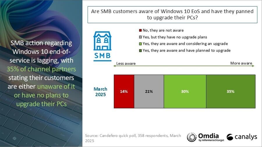 "Een peiling van Canalys in maart onder kanaalpartners die bekend zijn met de MKB PC-vernieuwingsplannen, onthult dat 14% zegt dat hun klanten zich niet bewust zijn van het einde van de ondersteuning van Windows 10. Nog eens 21% zegt dat hun klanten zich ervan bewust zijn, maar geen plannen hebben om te upgraden", aldus Dutt. "Voor klanten in deze situaties betekent de vertraging in de planning dat ze waarschijnlijk een duurdere omgeving tegenkomen wanneer het tijd is om hun PC's te vernieuwen."