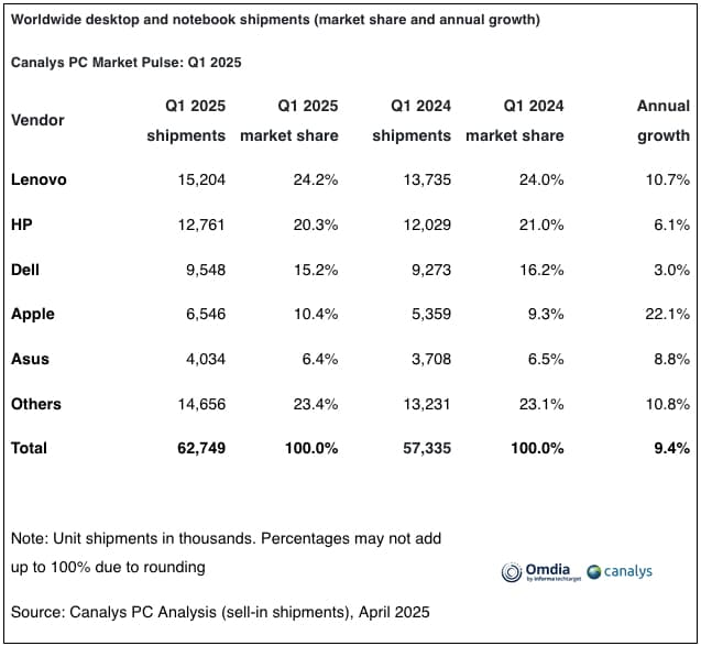 De leveringen van laptops (inclusief mobiele werkstations) bereikten 49,4 miljoen eenheden, een stijging van 10% ten opzichte van een jaar geleden. De leveringen van desktops (inclusief desktop werkstations) steeg met 8% naar 13,3 miljoen eenheden. De volumes in het eerste kwartaal werden verhoogd doordat OEM's de leveringen naar de VS opschroefden in verwachting van de eerste ronde van importheffingen door de Trump-administratie. Canalys waarschuwt dat de hogere tarieven die voor meer landen zijn ingevoerd het herstel van de wereldwijde PC-markt bedreigen.