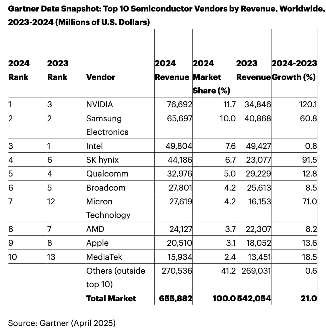 "Samsung Electronics behield de nummer 2-positie, aangedreven door winsten in zowel DRAM- als flashgeheugen, aangezien de prijzen scherp stegen als reactie op een onevenwicht tussen aanbod en vraag", zei Gupta. "De omzet van Intel groeide met 0,8% in 2024, omdat concurrentiedreigingen in alle belangrijke productlijnen toenamen en het niet in staat was om te profiteren van de sterke toename van de vraag naar AI-verwerking."