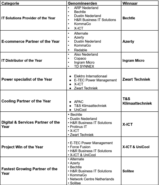 De jaarlijkse IT Partner Awards van Schneider Electric zijn uitgereikt. De prijzen zijn toegekend aan de meest succesvolle partners en distributeurs op het gebied van groei en innovatie. Dit jaar staan onder meer Azerty, Bechtle, Ingram Micro, Solitee, T&S Klimaattechniek, X-ICT, UniCool en Zwart Techniek in het zonnetje.