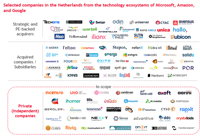 Grote internationale techreuzen zoals Microsoft, AWS, GCP leiden deze markt, ondersteund door een uitgebreid partnernetwerk van technologiebedrijven. De partnernetwerken ondersteunen klanten bij hun overstap naar de cloud en zorgen ervoor dat de techreuzen hun productaanbod kunnen verbeteren, hun marktreikwijdte kunnen vergroten, en innovatie kunnen stimuleren, aldus Marc Pietsch (adviseur BDO Tech M&A).