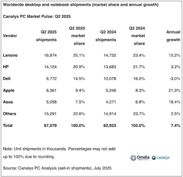 In het tweede kwartaal van 2025 behield Lenovo zijn positie als wereldwijde marktleider in de PC-markt met 17,0 miljoen verzonden desktops en notebooks, een jaar-op-jaar stijging van 15,2%. HP behield de tweede plaats met 14,1 miljoen eenheden, wat een jaarlijkse stijging van 3,2% betekent. Dell, op de derde plaats, zag een daling van 3,0% in verzendingen, met een totaal van 9,8 miljoen eenheden. Apple behaalde de vierde plaats met een indrukwekkende groei van 21,3%, met 6,4 miljoen eenheden en een marktaandeel van 9,4%. Asus rondde de top vijf af met een groei van 18,4%, met 5,0 miljoen eenheden.