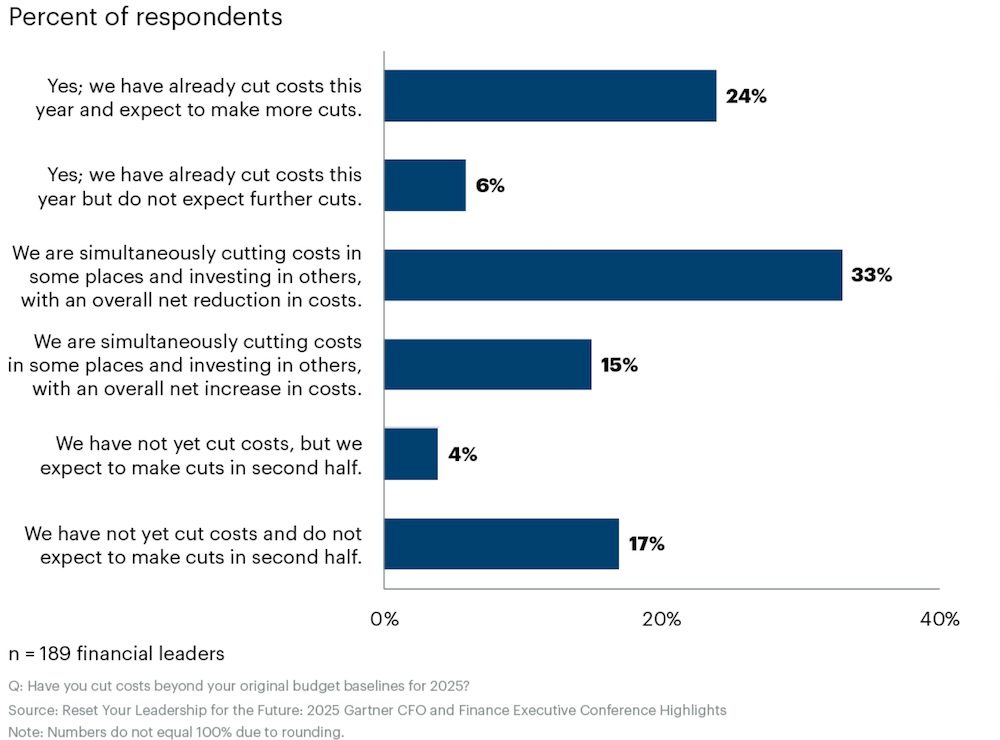 Verder is 67% van de financiële leiders momenteel bezig met kostenverlagingen door bezuinigingen door te voeren.