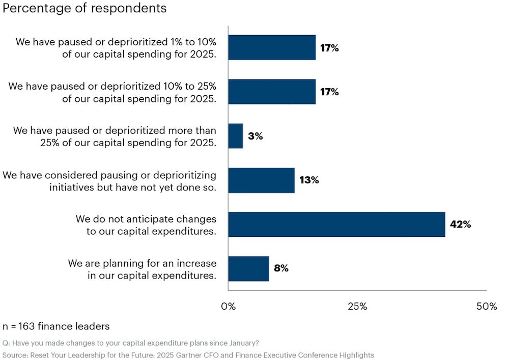 Gartner voerde in juni tijdens een webinar een peiling uit onder 197 financiële leiders. Hieruit blijkt een sterke neiging tot voorzichtigheid en de bereidheid om kapitaaluitgaven te pauzeren of te deprioriteren. Drie procent van de respondenten geeft aan meer dan 25% van de kapitaaluitgaven voor 2025 te pauzeren of te deprioriteren (zie Figuur 1).