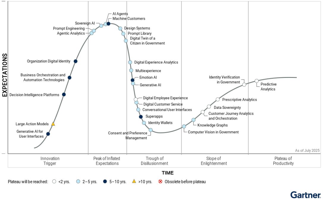 De komende twee tot vijf jaar gaan sovereign AI (nationaal gestuurde AI) en AI-agents een belangrijke rol spelen in de adoptie van kunstmatige intelligentie door de publieke sector, voorspelt marktonderzoeker Gartner in de Hype Cycle for Government Services 2025. Beide technologieën hebben volgens het rapport de fase van overdreven verwachtingen bereikt, een moment waarop de hype rondom een technologie piekt voordat praktische toepassingen vorm krijgen.