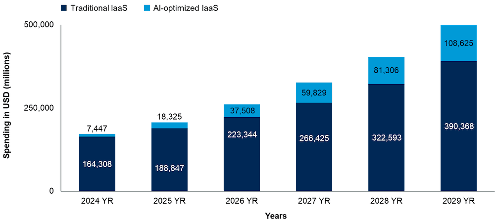 AI-geoptimaliseerde IaaS omvat hardware zoals grafische processors (GPUs), application-specific integrated circuits (ASICs) en andere versnellers die geschikt zijn voor grootschalige AI-toepassingen. Traditionele cloudinfrastructuur, gebaseerd op centrale processors (CPUs), kan volgens Gartner moeilijk voldoen aan de groeiende behoefte aan gespecialiseerde rekenkracht voor AI en generatieve AI.