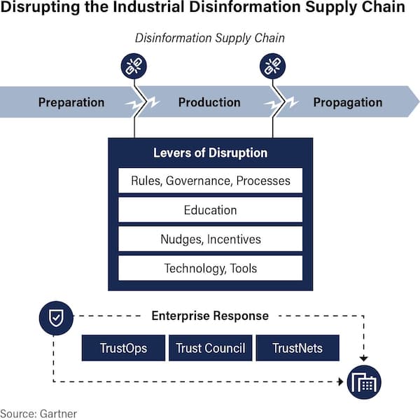 Om de transparantie en geloofwaardigheid van content te waarborgen, introduceert Gartner het concept TrustOps: een proactieve aanpak om de betrouwbaarheid van organisaties te versterken en risico’s door desinformatie te beperken. Richard Hunter, mede-auteur, legt uit: "Het idee is om vertrouwen niet te zien als een bijproduct van marketing of compliance, maar als een bewust operationeel doel – om de integriteit van content te beschermen en het consumentenvertrouwen te vergroten."